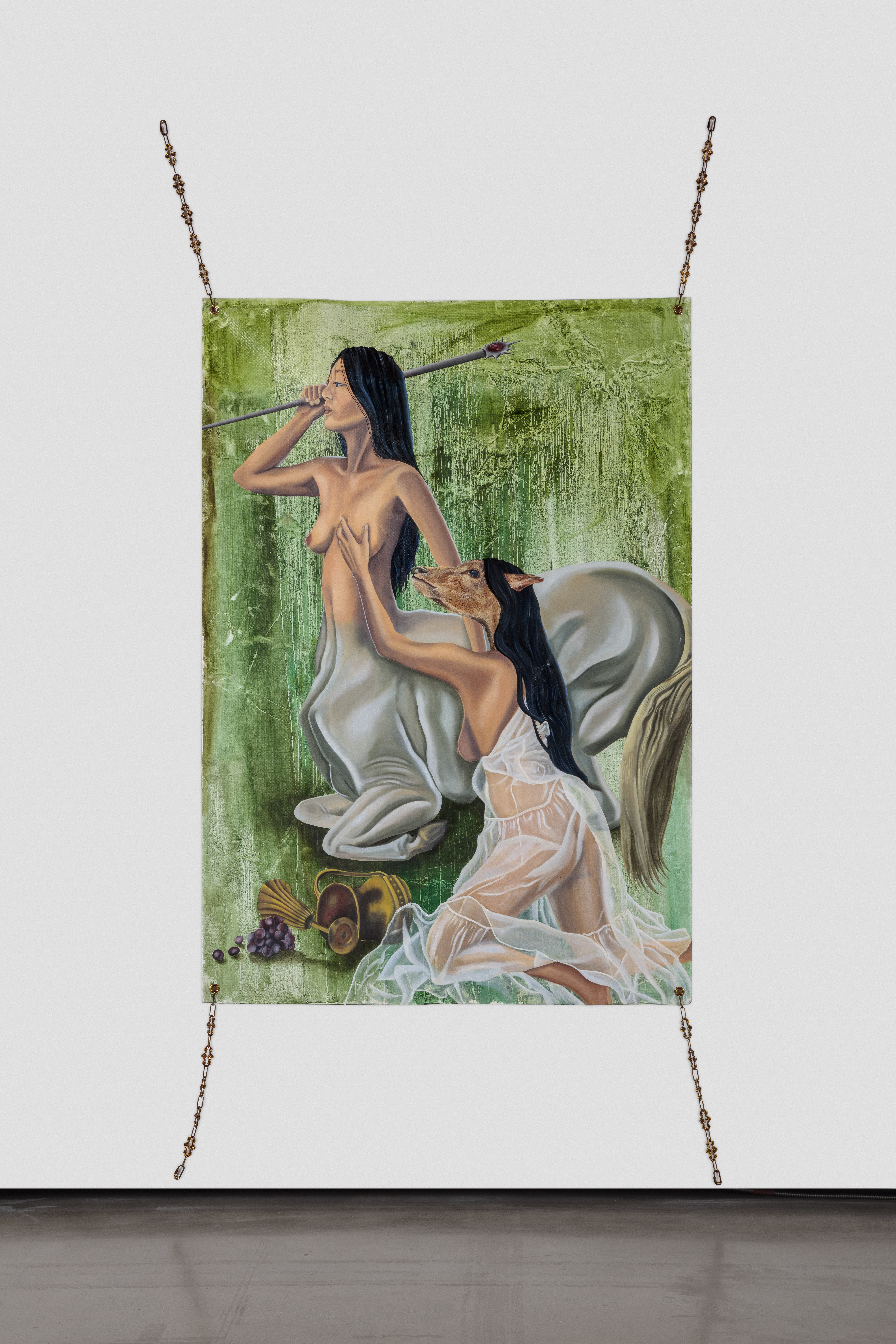 oil on linen, chains, ribbons